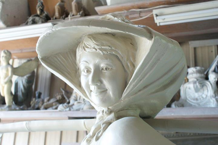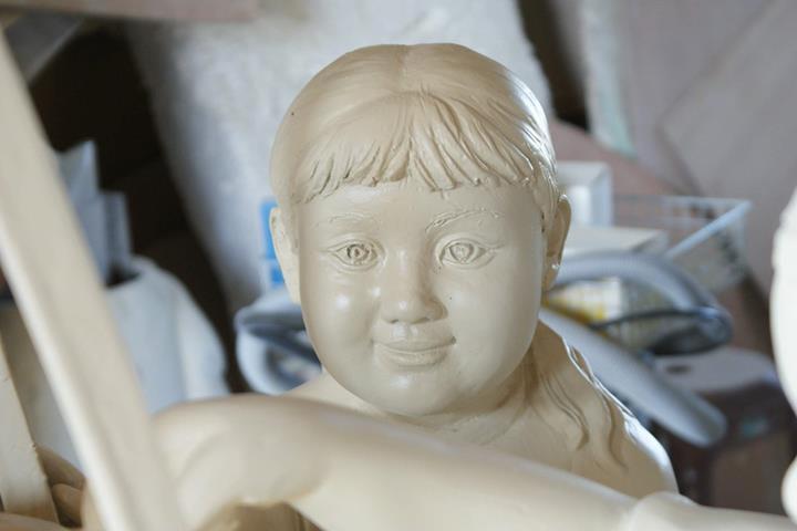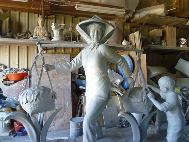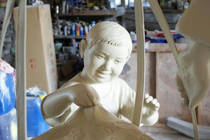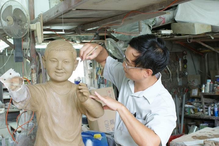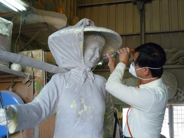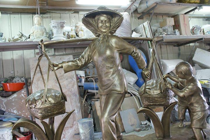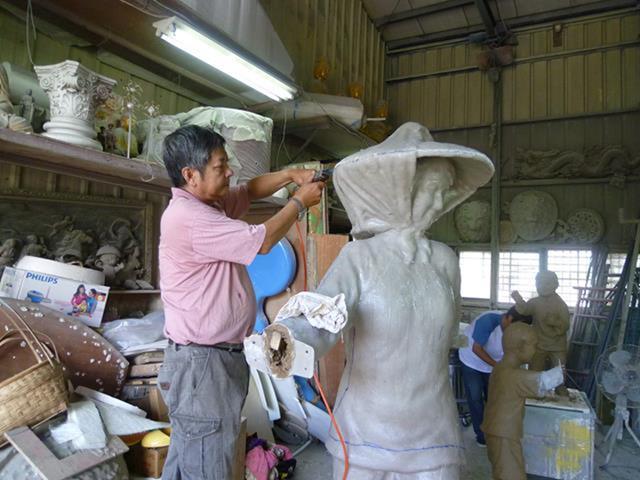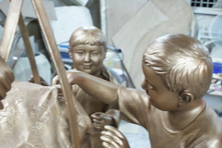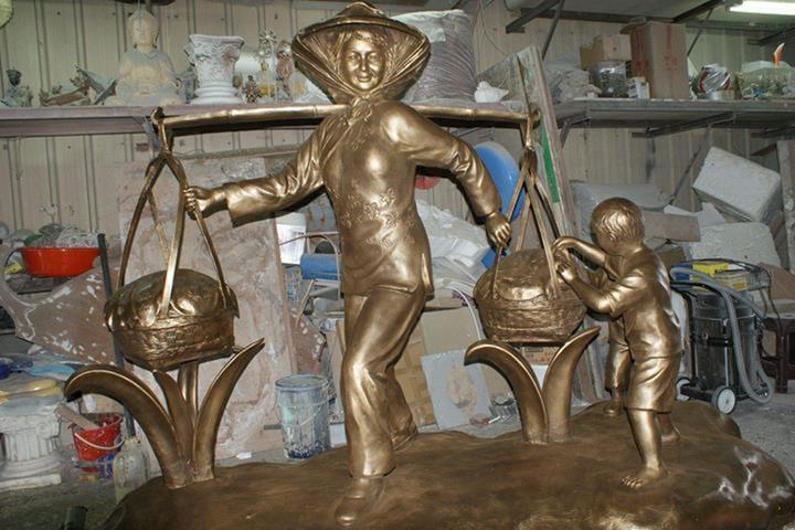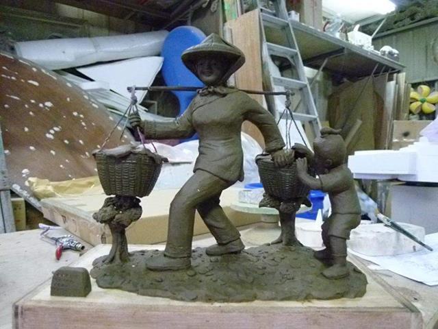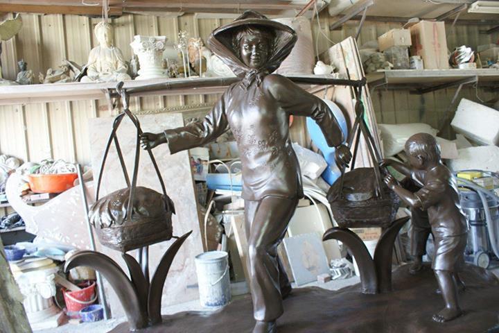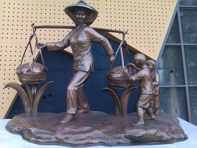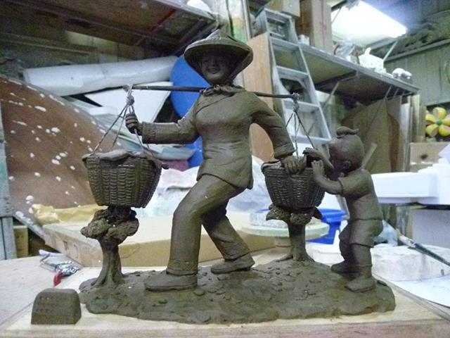 原型:泥塑 材質:鑄銅 時間:2013 創作意涵: 「打中午」的習俗就是,我們這個村庄的住戶,每家每戶都煮,各煮一樣東西出來,都是煮一些客家人的點心,像我們就是炒糯米飯,還有包菜包,還有煮酸菜湯,隔壁的,像我隔壁的那間,鄰長的就是包粽子,還有煮雞酒這些,一人煮一樣出來,大家中午在這裡打中午這樣。