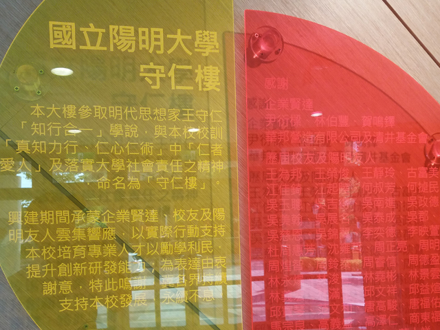 設置地點:陽明大學守仁樓 材質:壓克力雷射切割、樹脂化工法 時間:2017 設計:金唐山設計工程 製作:金唐山設計工程 監造:陽明大學