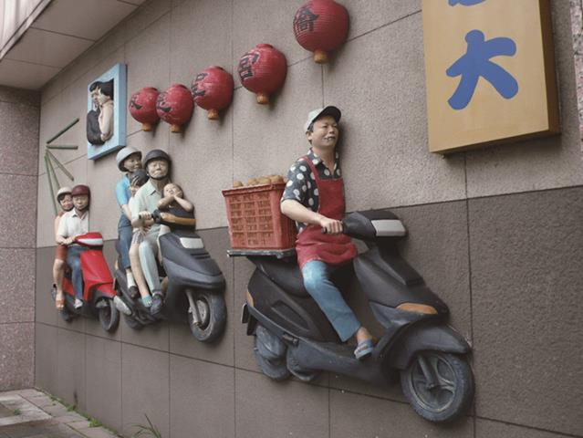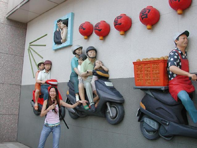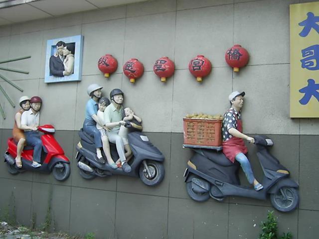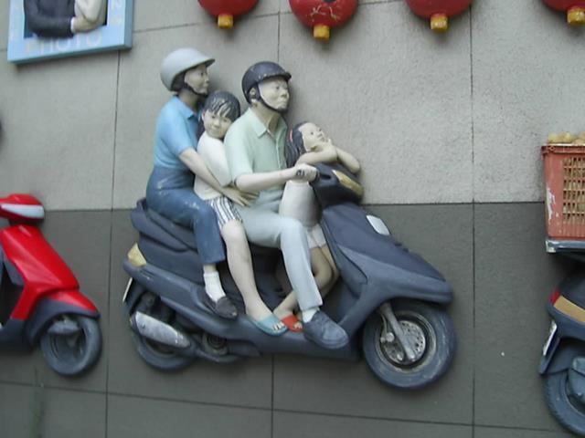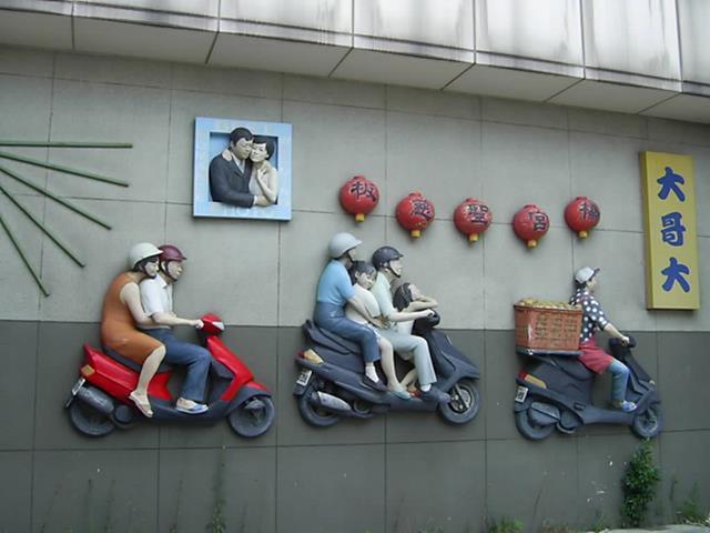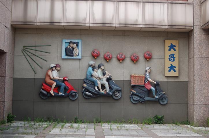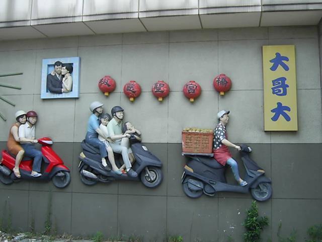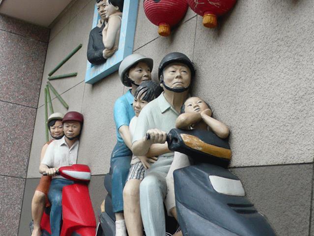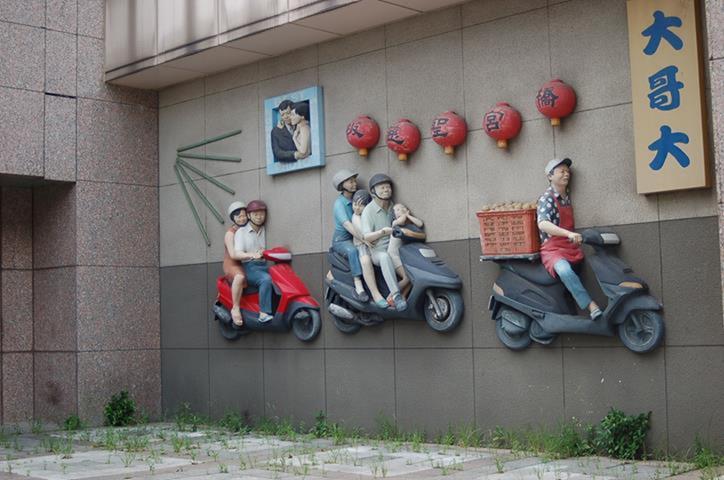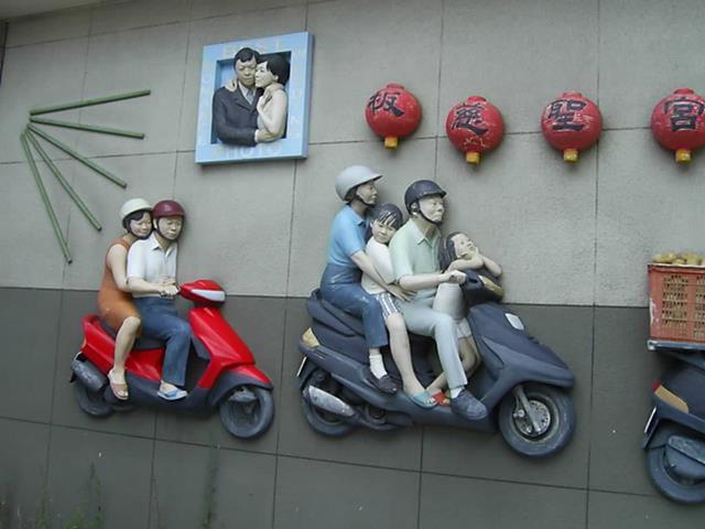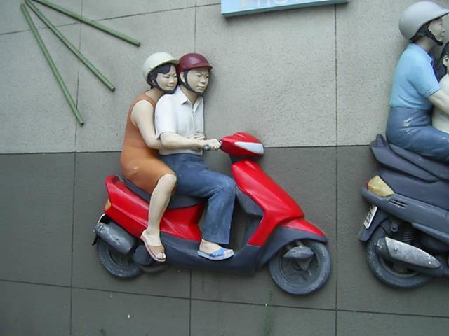 設置定點:板橋捷運站 原型:泥塑 材質:FRP 時間:2002 創作意涵: 回家啦!!!看到一台台的機車都冒出來,接到上也活像個夜市般,熱鬧得不得了。 板橋的人事物,都變得特別親切,生活也變得更加趣味。 設計:曲家瑞 製作:金唐山設計工程 監造:台北捷運局