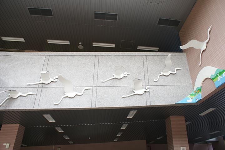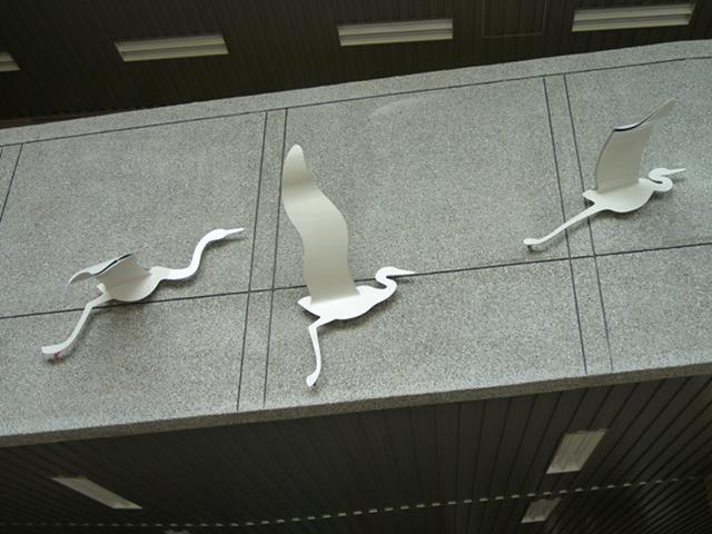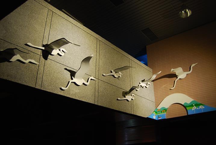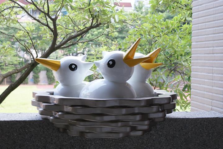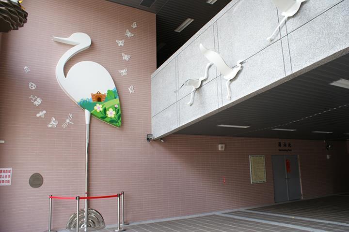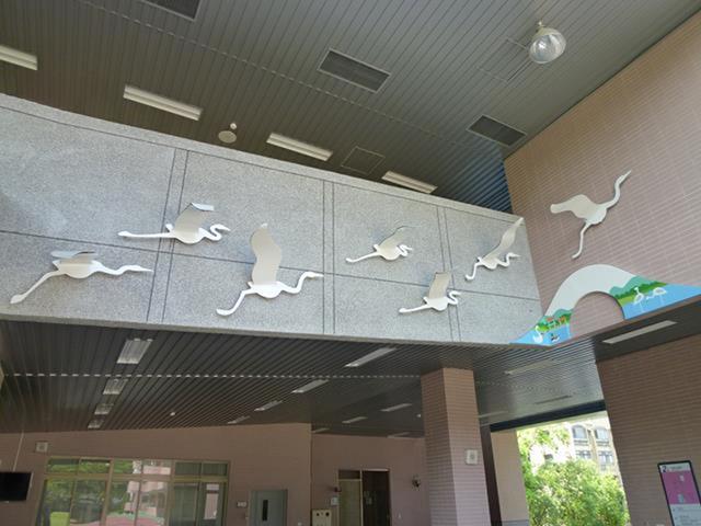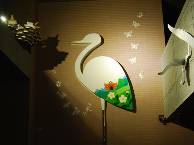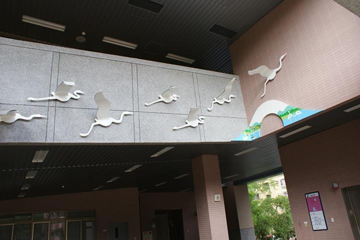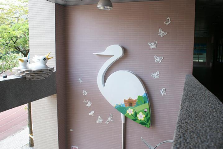 白鷺鷥佇立在波光粼粼的清澈湖水中,以溫柔卻又堅定的姿態守護著巢中的雛鳥。翅膀上映照的圖樣不只象徵著牠被優美的景色環繞,更象徵著牠自身對環境的感念,如同大湖國小一般不只是被大自然寵愛的天之驕子,也是能對環境回報以關愛保護之情的優質校園,而白鷺鷥看顧著雛鳥更是代表這溫暖校園中化雨春風般的師長們對學生和藹親切、循循善誘的教導。