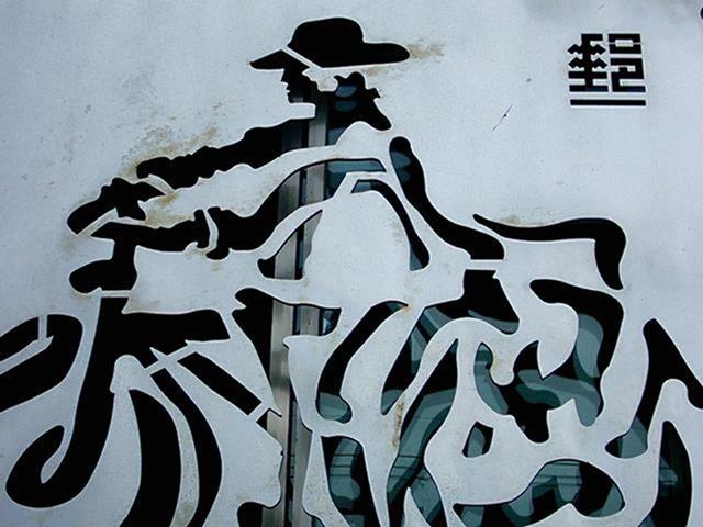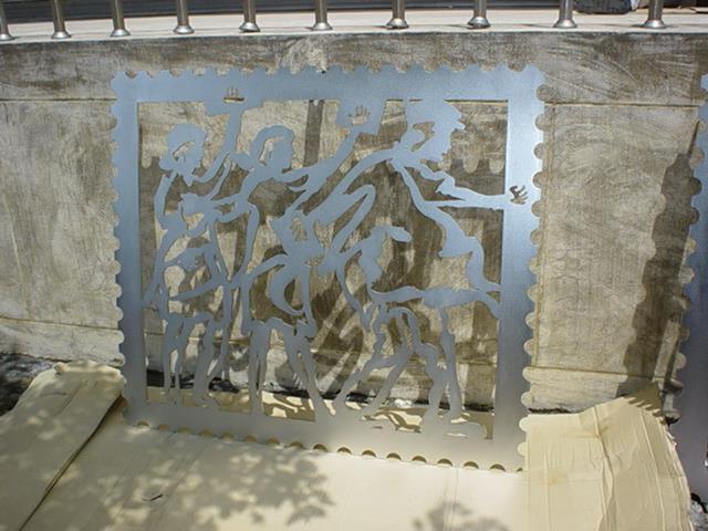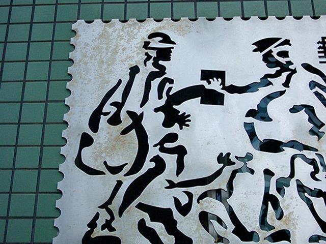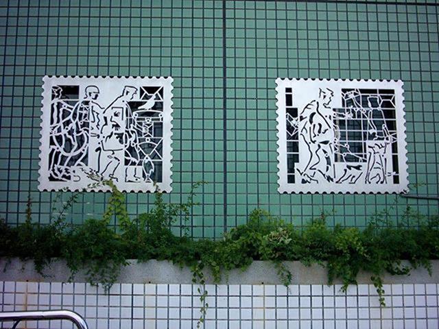 郵政人員在郵票內推著如履帶的郵票齒孔,表達郵票推動訊息傳送的功能,冷冰冰的封閉牆面,多了一個窗口,感覺到在與往來的民眾對話,傳遞街道上所發生的事情。