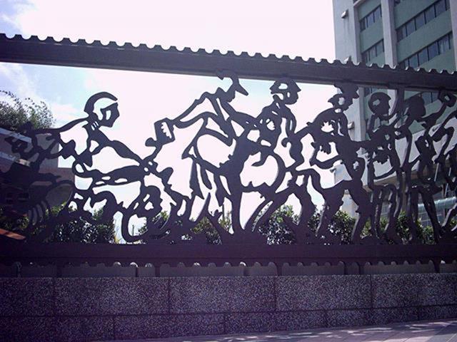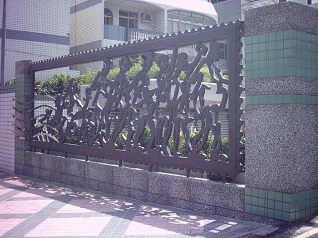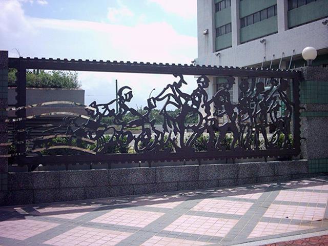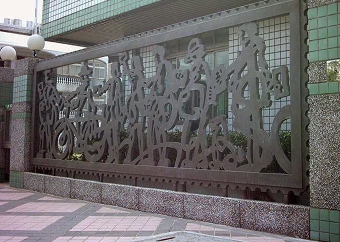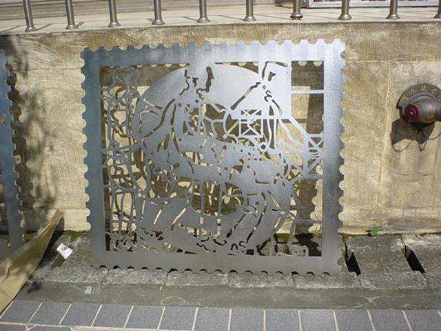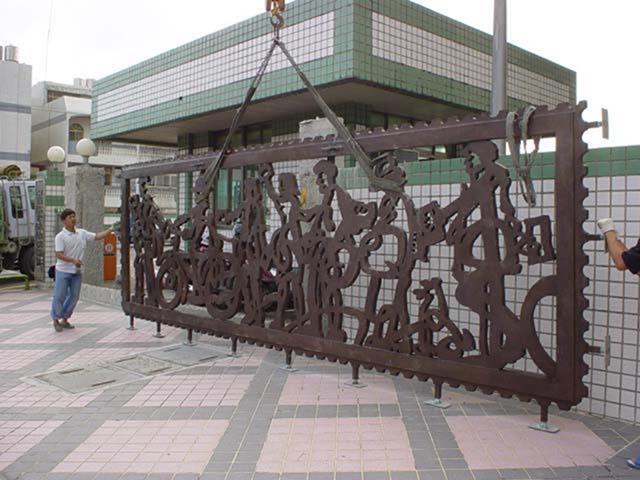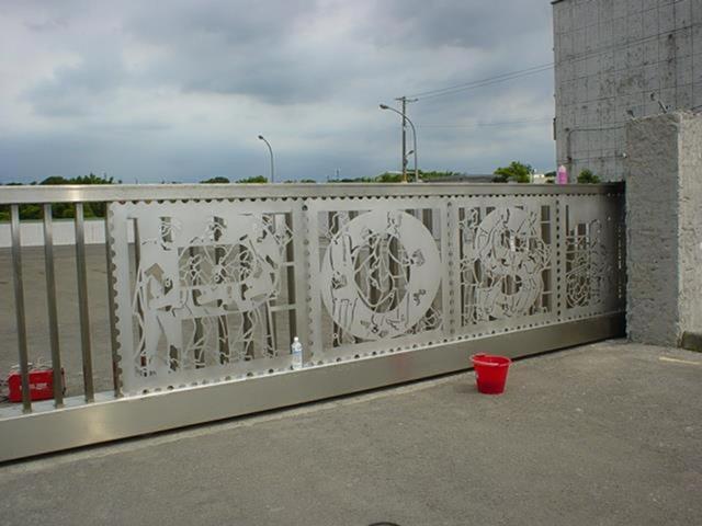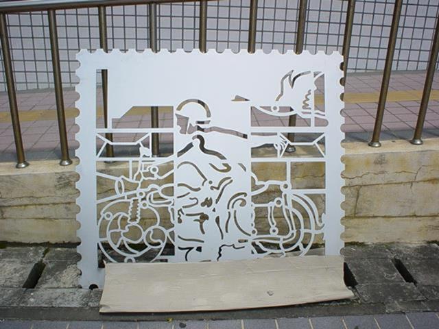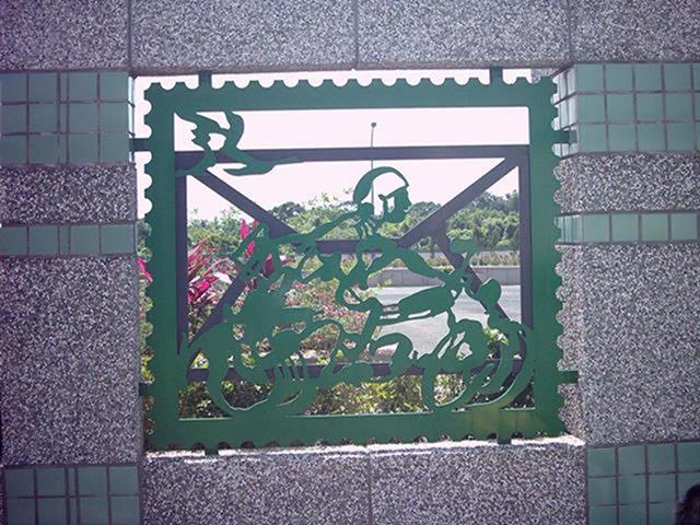 設置定點:北區郵政處理中心 原型:泥塑 材質:鑄銅 時間:2002 創作意涵: 郵政人員在郵票內推著如履帶的郵票齒孔,表達郵票推動訊息傳送的功能,冷冰冰的封閉牆面,多了一個窗口,感覺到在與往來的民眾對話,傳遞街道上所發生的事情。 設計:陳健建築師 製作:金唐山設計工程 監造:桃園郵政