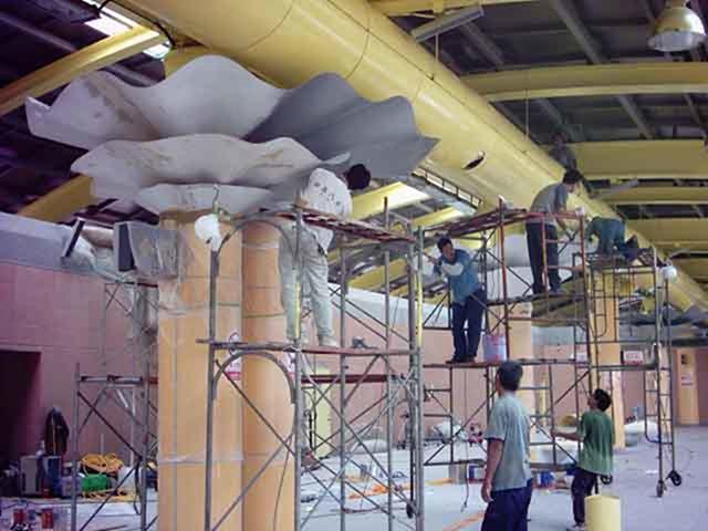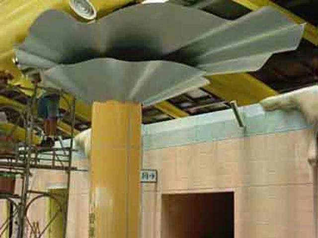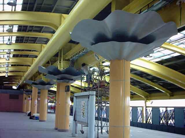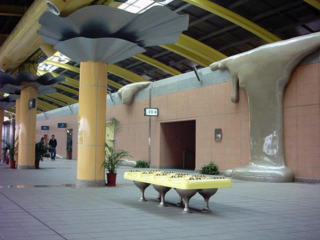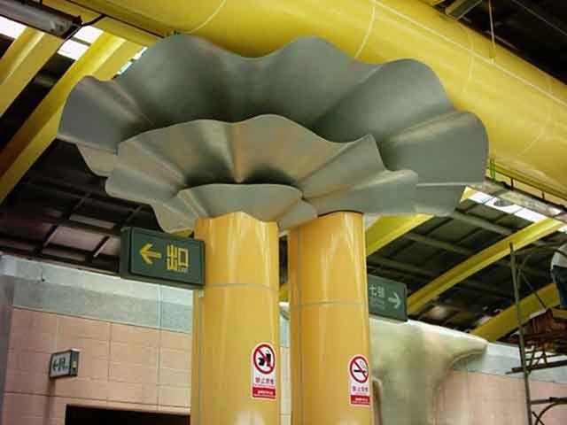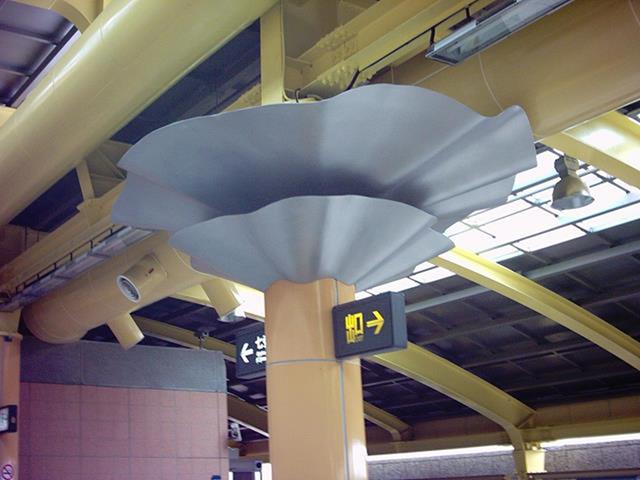 波浪的雲朵造型,被巧妙的至於柱子頂端,讓整個室內空間,也隨之寬廣,猶如身處雲中,隨著波浪的律動,讓月台多添了一股活潑的氣氛。