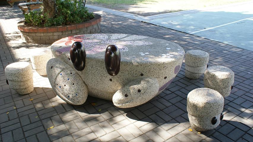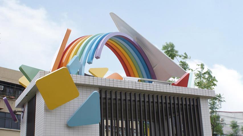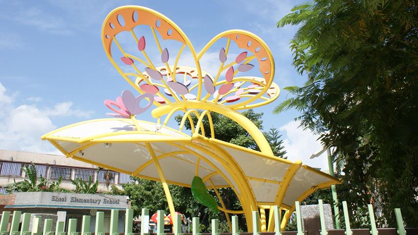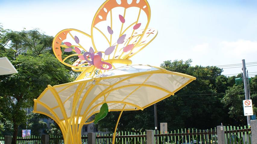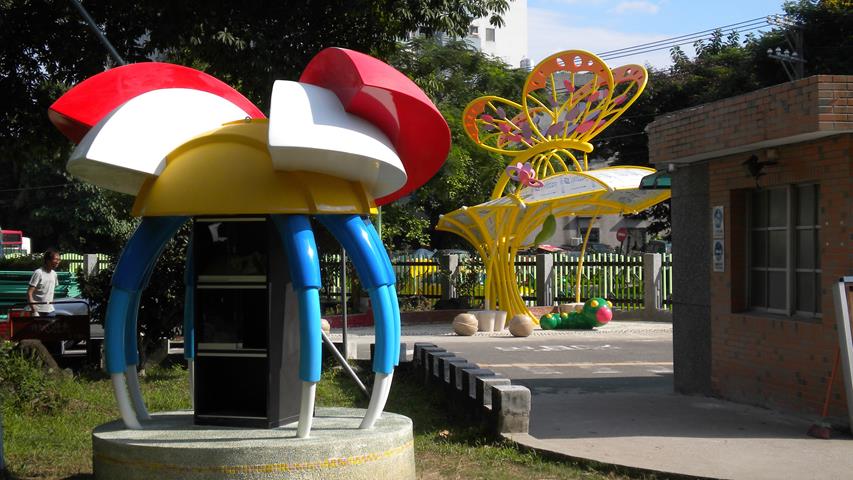 設置定點:社子國小 原型:複合材料 材質:不鏽鋼、花崗石、青銅烤漆、薄膜結構、FRP、太陽能光電板、GRC、馬賽克、抿石子、多彩石、陶板 時間:2010 創作意涵: 走進孩子內心的世界一起築夢,共乘紙飛機一同遨遊,天馬行空的創作伴隨著成長,讓我們一同乘著隱形的翅膀,一步一步實現夢想。 設計:金唐山設計工程 製作:金唐山設計工程 監造:社子國小