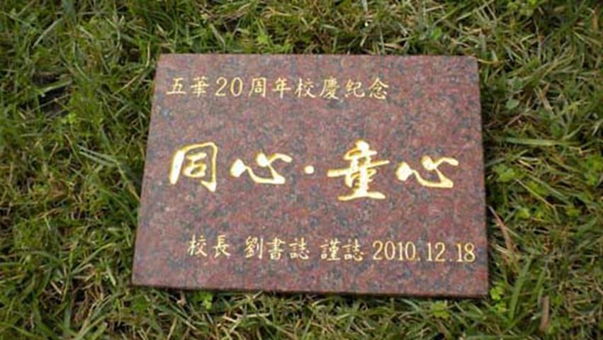 設置定點:新北市三重區五華國小 材質:FRP、汽車烤漆、馬賽克、抿石子、太陽能地底燈 時間:2010 創作意涵: 以樂觀進取、豐富學習,健康成長為主軸。用大愛精神為出發點之心境,讓親師共同為孩子們付出關懷,讓同學們多個夢想,多個希望! 設計:金唐山設計工程 製作:金唐山設計工程 監造:五華國小